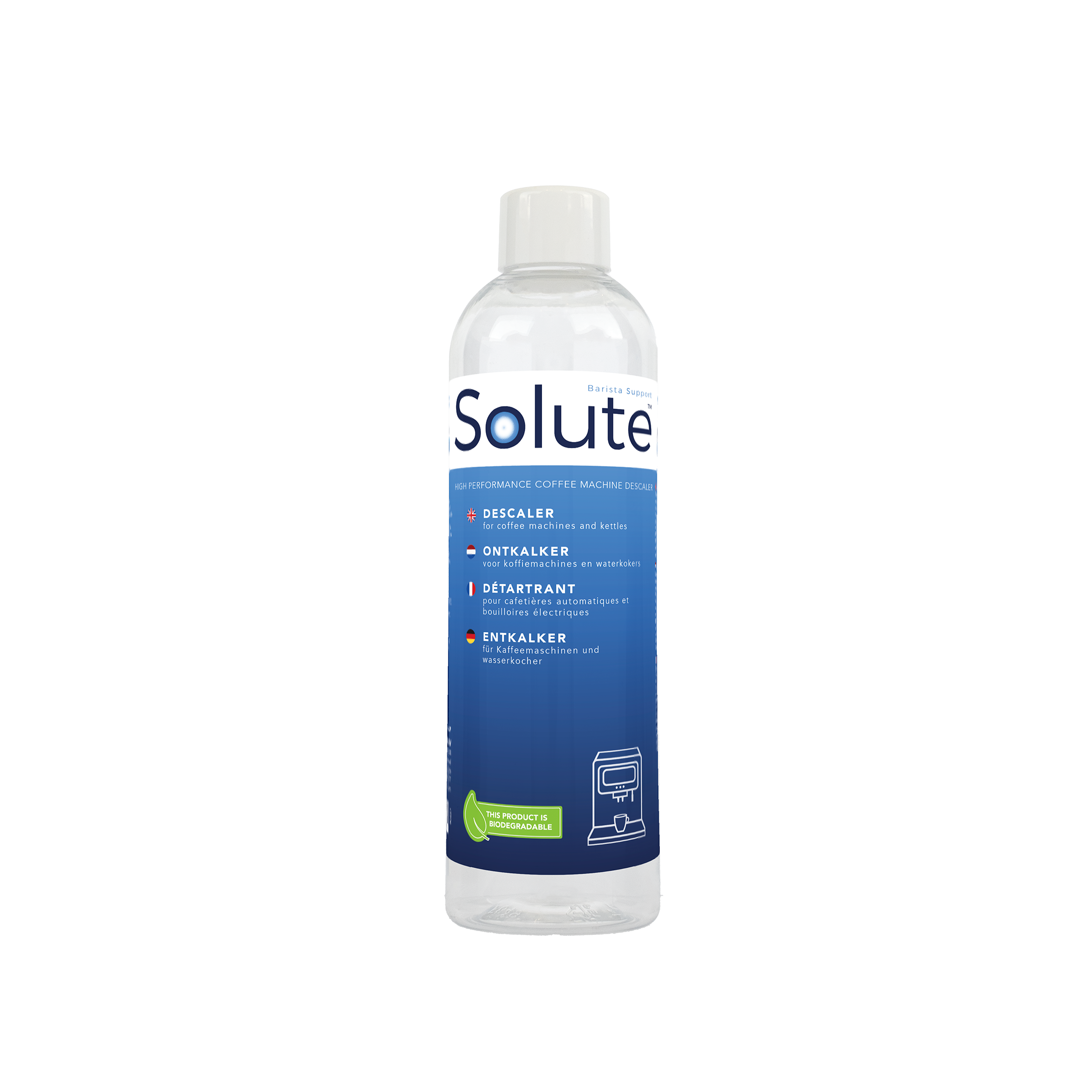 De 250 ml ontkalker van Solute is ontwikkeld voor het regelmatig ontkalken van volautomaten, espressomachines en filterapparaten van alle merken.